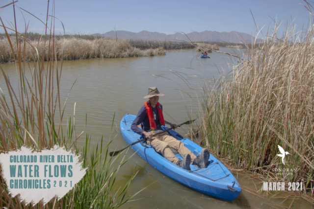 El agua fluye a través de Chausse, un sitio de restauración administrado por la organización Restauremos el Colorado, asociada con el Sonoran Institute y otras organizaciones sin fines de lucro, en la Alianza Revive el Río Colorado. Estos equipos de científicos están muy emocionados de medir qué tan rápido fluye el agua. Algunos de los miembros del equipo incluso dejan asomar una lágrima al recordar toda la planeación y las negociaciones que tardaron años en concretarse.