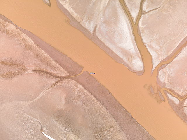 Científicos en un bote pequeño en el estuario del río Colorado visto desde el dron.