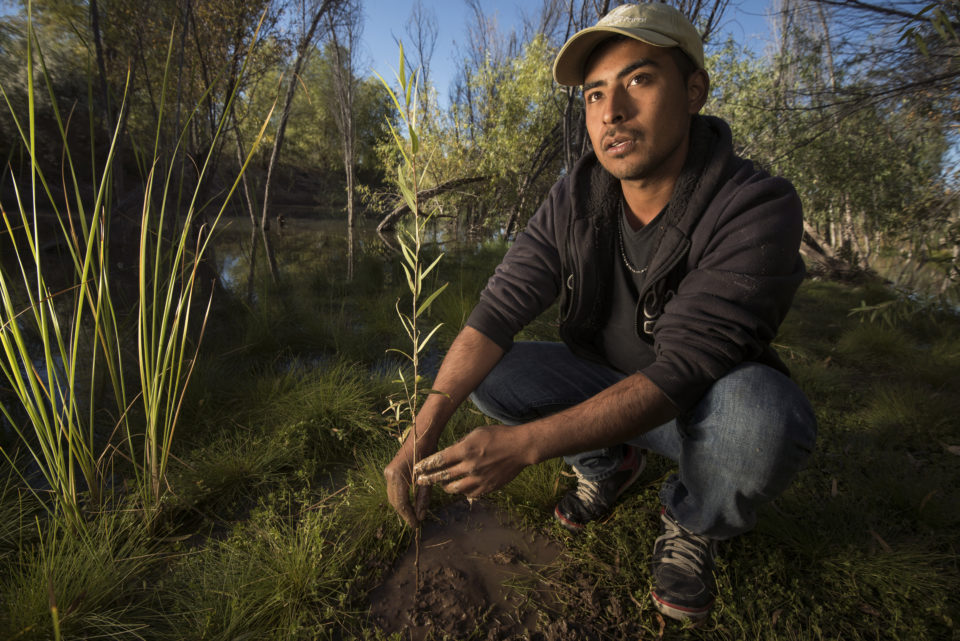 Daniel Chavez planting a willow seedling in Laguna Grande a restoration project run by the Sonoran Institute in the Colorado River Delta, Baja California, Mexico. ©Bill Hatcher, 2014